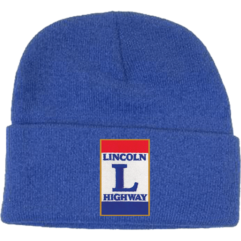 Royal Blue acrylic knitted cuffed beanie with Lincoln Highway patch embroidered on front.One size fits all.